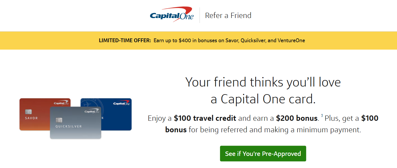 - Welcome bonus: Receive a $100 Capital One Travel credit upon account opening, plus $200 cash bonus (Quicksilver and Savor) or 20,000 bonus miles (VentureOne) after spending $500 within the first three months of account opening.