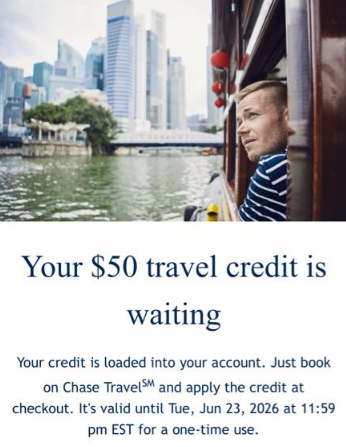 You can use this one-time $50 credit toward any purchase on Chase Travel. To redeem, just book your itinerary through Chase Travel by June 23, 2026.