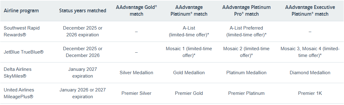 If you have an eligible Delta SkyMiles, United MileagePlus, JetBlue TrueBlue or Southwest Rapid Rewards elite status, then this is a good opportunity to also experience the equivalent or better at American Airlines.