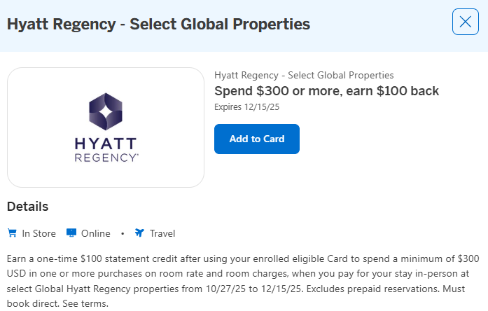 Earn a one-time $100 statement credit after using your enrolled eligible Card to spend a minimum of $300 USD in one or more purchases on room rate and room charges, when you pay for your stay in-person at select Global Hyatt Regency properties from 10/27/25 to 12/15/25. Excludes prepaid reservations. Must book direct.