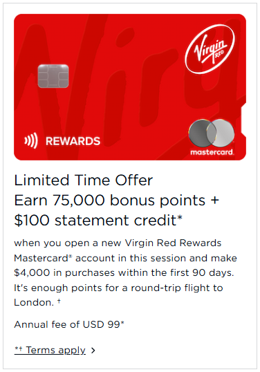- New cardholders can earn 75,000 Virgin Points plus a $100 statement credit after spending $4,000 in the first 90 days.