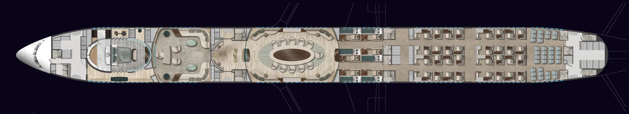 One of the standout features is the VVIP section at the front with a unique private bedroom that is expandable and highly functional. The detailed design will be revealed later this year. A spacious office and reception area divides the private section from the remaining areas of the aircraft. The cabin also boasts a large majlis, with a design that seamlessly flows throughout the entire cabin.