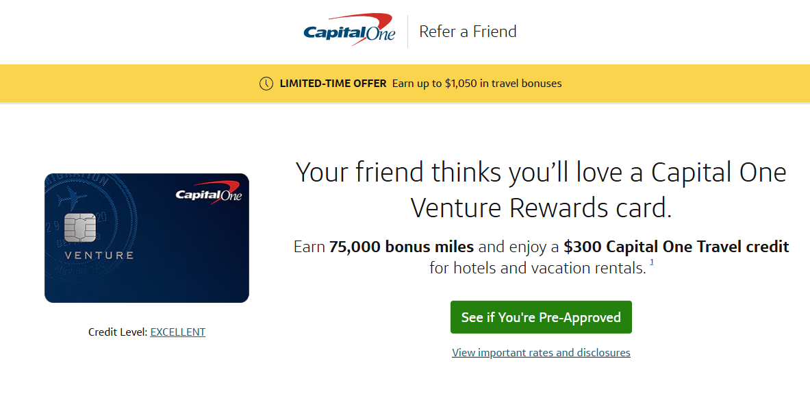 This is a good offer for the Capital One Venture Card, and it is only available through referral links. The best ever offer was for 100,000 miles plus a $250 travel credit.