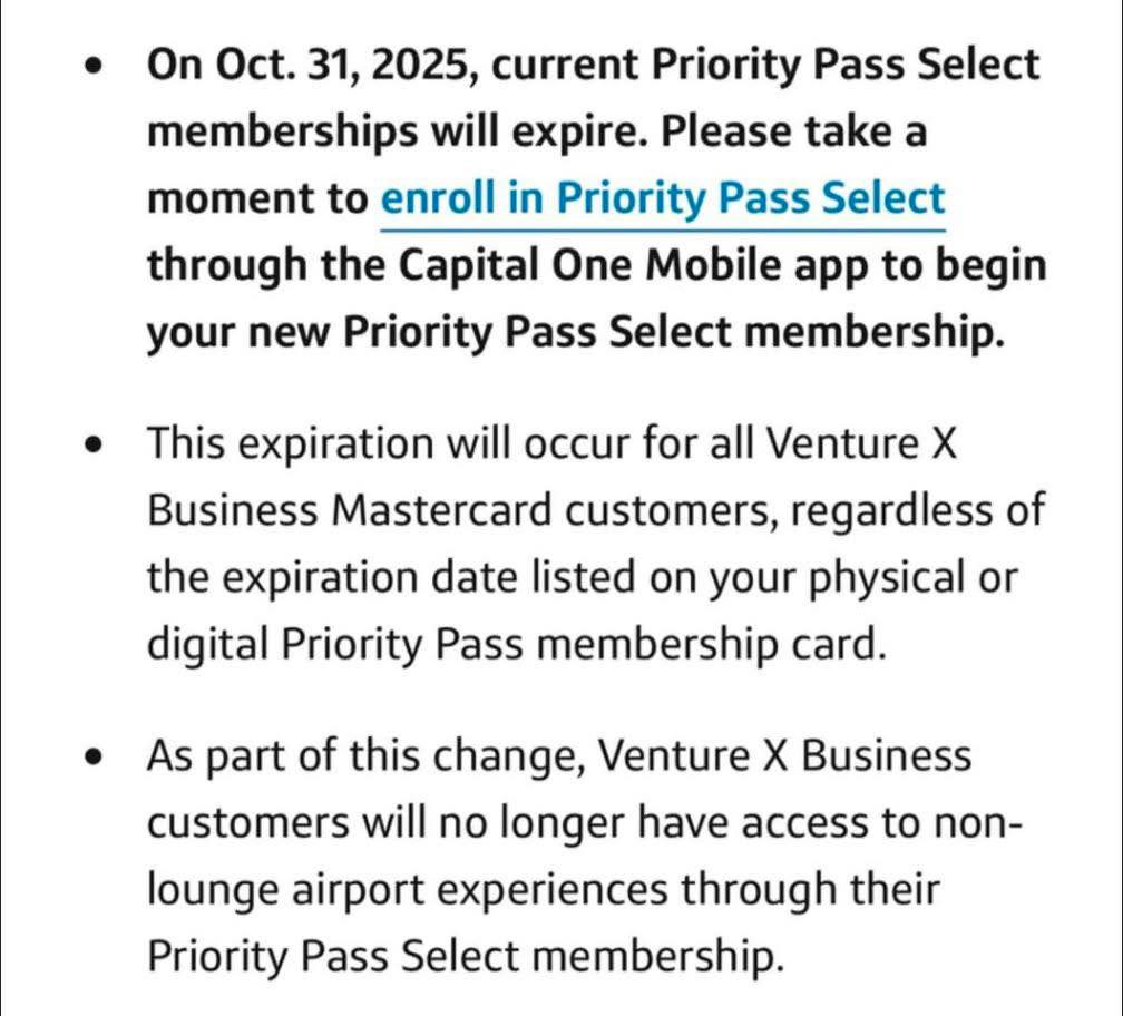 Update: Venture X Business cardholders who have the Mastercard version will also lose access to non-lounge airport experience in Oct. 31, 2025. That’s when their current Priority Pass Select membership will expire, and they will have to re-enroll.