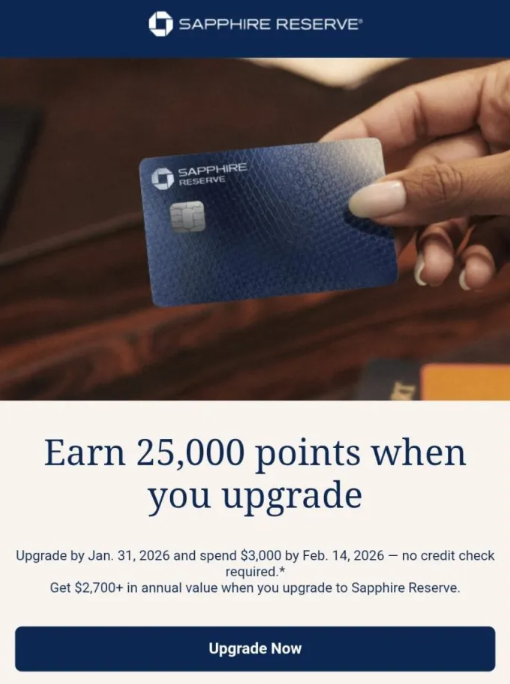 Earn 25,000 points when you upgrade from Sapphire Preferred to Sapphire Reserve by January 31, 2026 and spend $3,000 or more by February 14, 2026.