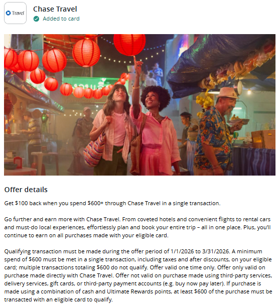 Chase has launched a new Chase Offer for Sapphire, Freedom, Ink, and J.P. Morgan Reserve cardholders, offering a $100 statement credit when they spend at least $600 on Chase Travel in a single transaction.