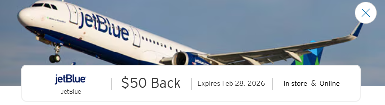 Earn $50 back on a purchase of $200 or more at JetBlue when you use your eligible Citi card. Offer expires on February 28, 2026.