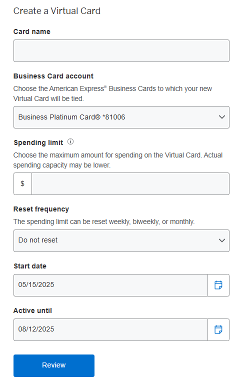 Once created, Business Card Members can easily review how much has been spent on their Virtual Card and on what, and when Cards will expire. Business Card Members can even have their Virtual Cards reset with adjustable spending limits and controls like reset frequency, start date and “active until” date.