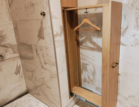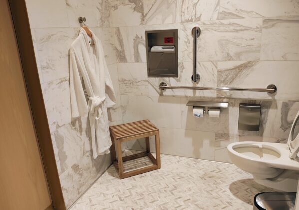 The shower suites are a step above anything I’ve experienced domestically. The bathroom’s design and decor competes with or exceeds what I’ve experienced in many luxury hotels. I took advantage of the pull-out closet nearby the shower to hang my clothing. Next to the centrally-located vanity is an elevated platform to store baggage. On the other side of the large suite is a dressing bench across from the toilet.