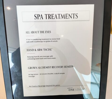 Later in the morning, I reserved a spa treatment, choosing the head, neck, and shoulders massage. The ten-minute massage lasted a bit longer than I expected. The lounge offers massage chairs, but I recommend one of the attendant-provided options, if they’re available on your visit.