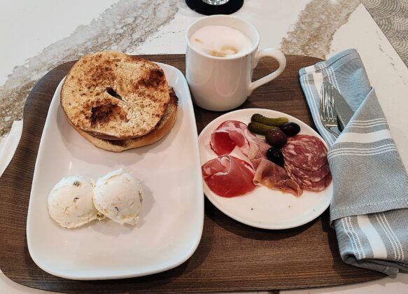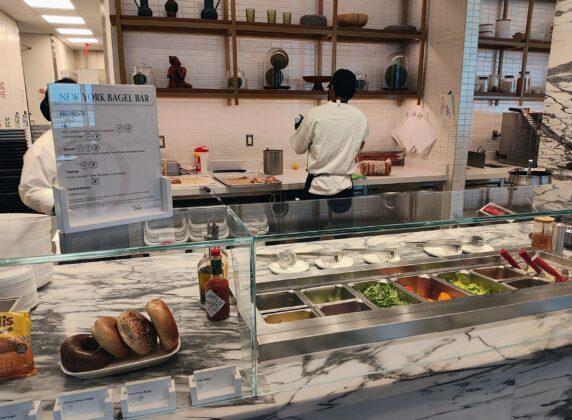 The market provides delightful options in a refined yet low-key manner. I approached the counter to request a fresh everything bagel with jalapeno cheddar spread, and a worker happily obliged. I quickly realized I should’ve walked the entire market before my order, as guests can order custom items such as omelets, eggs, and bakery items or opt for available proteins. All of the ready-made items are located behind glass. Actually, the only self-serve options I found in the entire club were a few coffee machines and a soda fountain. While some may find this inconvenient, I actually preferred requesting items. Most of the time, the helpful employees offered beverages without me asking. In a world of increasingly-disrespectful behavior – in lounges and otherwise – I applaud Delta for taking more control of the space. And, bigger picture, the market dining experience felt a lot classier than standing in a Centurion Lounge cafeteria buffet line.