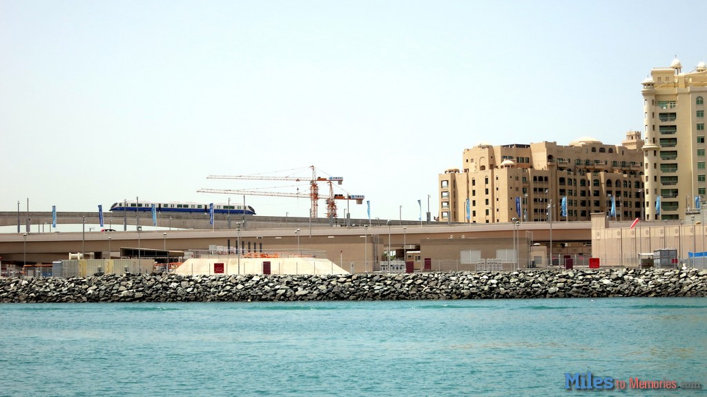 The Dubai Ferry doesn’t go out around the Palm Jumeirah, but instead travels underneath the Dubai Monorail at the entrance to the islands as it begins to pull into the Marina area.