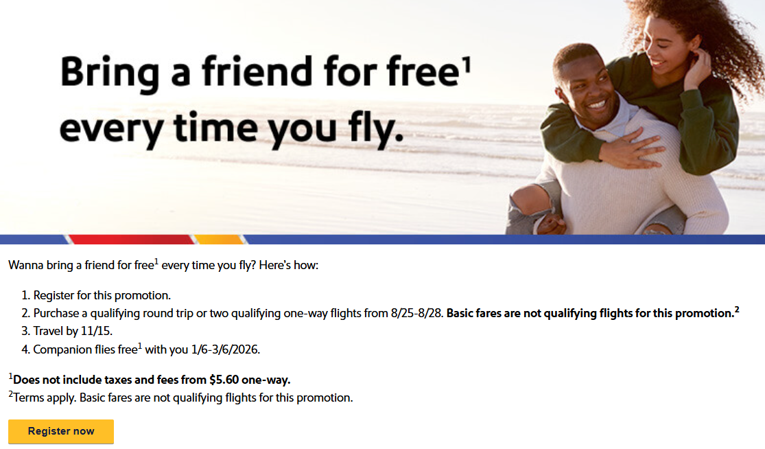 - Member’s Rapid Rewards account number must be entered at the time of booking Member’s qualifying flight to earn a promotional Companion Pass valid for use between January 6, 2026 and March 6, 2026.