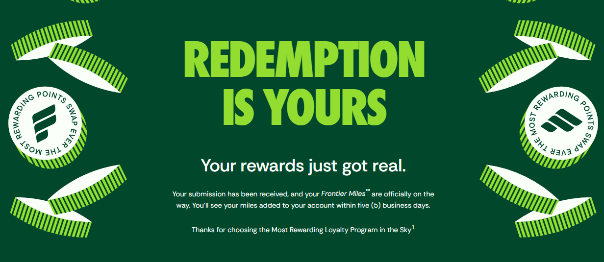 Travel Miles will be credited to the participant’s Frontier Miles® account within five (5) business days following submission, provided all eligibility requirements are met. Limit to one (1) Promotion entry per eligible Frontier Miles® account holder during the entire Promotion period.