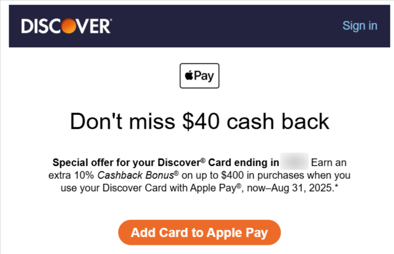 Earn an extra 10% Cashback Bonus® on up to $400 in purchases when you use your Discover Card with Apple Pay®, now–Aug 31, 2025. The offer is already active for targeted card.