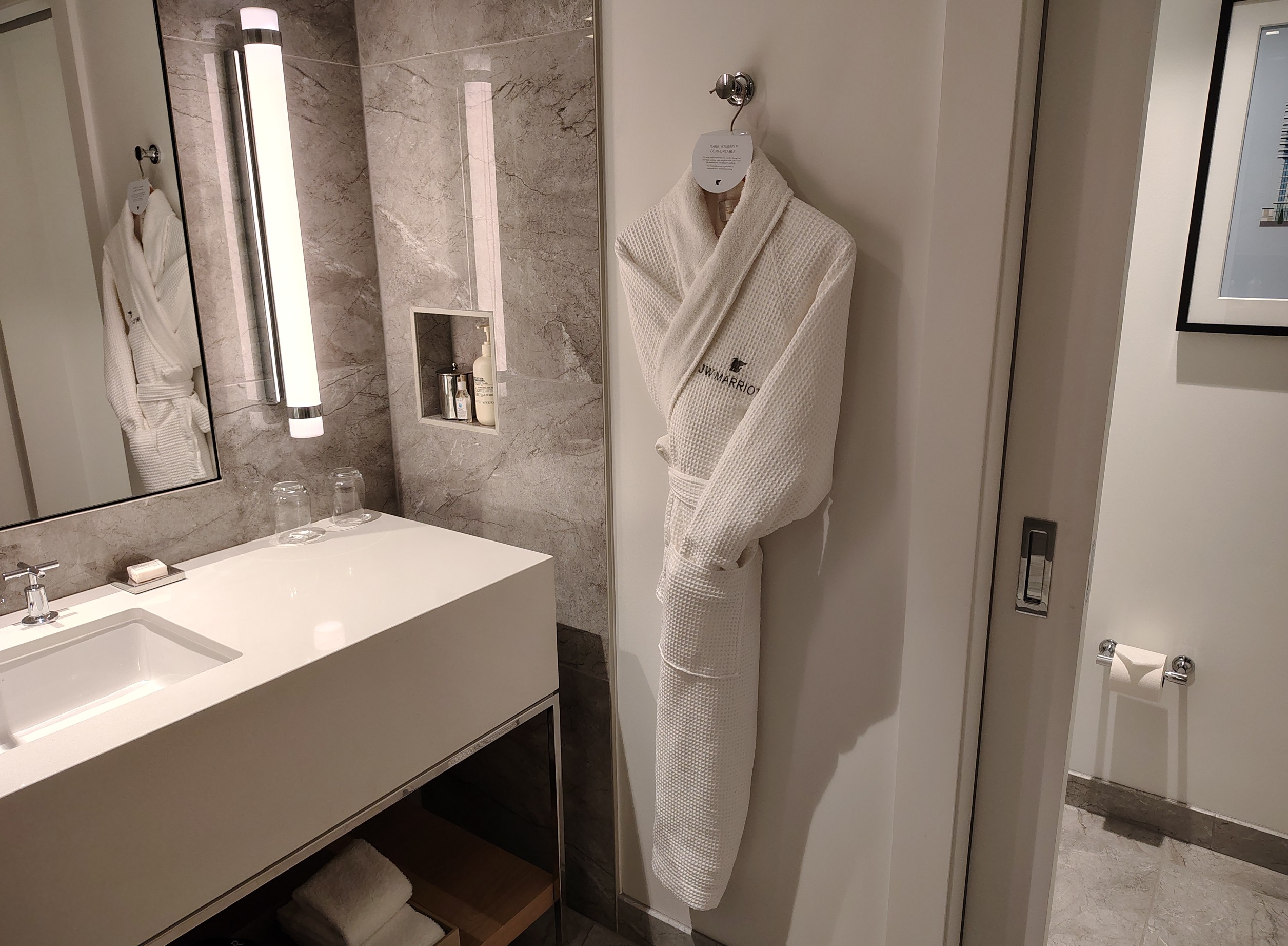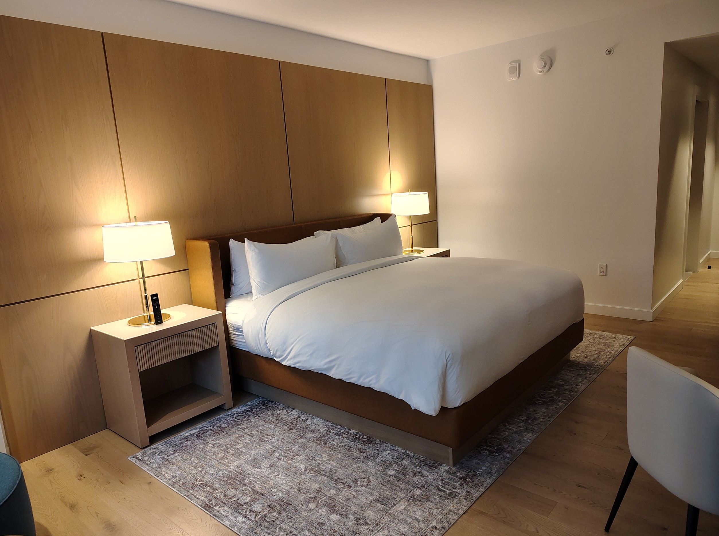 Upon entry to my sixth-floor room, I passed a long dressing bench, mirror and wardrobe on the left, with a healthy-sized bathroom to the right. I tolerated the bathroom’s sliding doors while appreciating the wide single vanity and large shower with Le Labo amenities. The powder room was off to the right with yet another sliding door. Towels felt refreshingly new, like most everything in this few-months-old property. Lighting was simple and functional throughout the room.