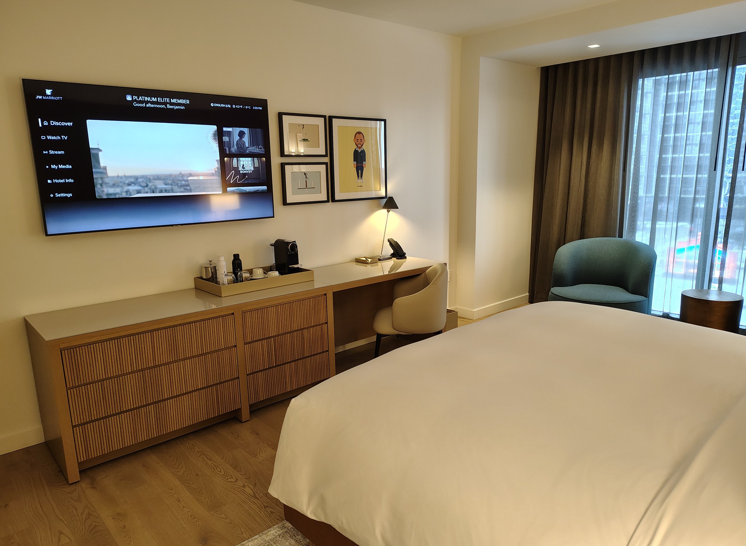 I arrived a bit prior to 3 pm, hoping to obtain a room before the hotel’s official 4 pm check-in time. The front desk agent promptly addressed this, confirming rooms were available. I then asked about a possible upgrade as a Marriott Bonvoy Platinum. After some searching, the rep advised none were currently available due the hotel’s occupancy and ongoing housekeeping. I clarified I was more interested in an immediately-available room, anyway, even if that meant giving up a later upgrade. He assigned my booked room, a deluxe king, and offered a 4 pm late checkout due to my Platinum elite status. I happily accepted both.