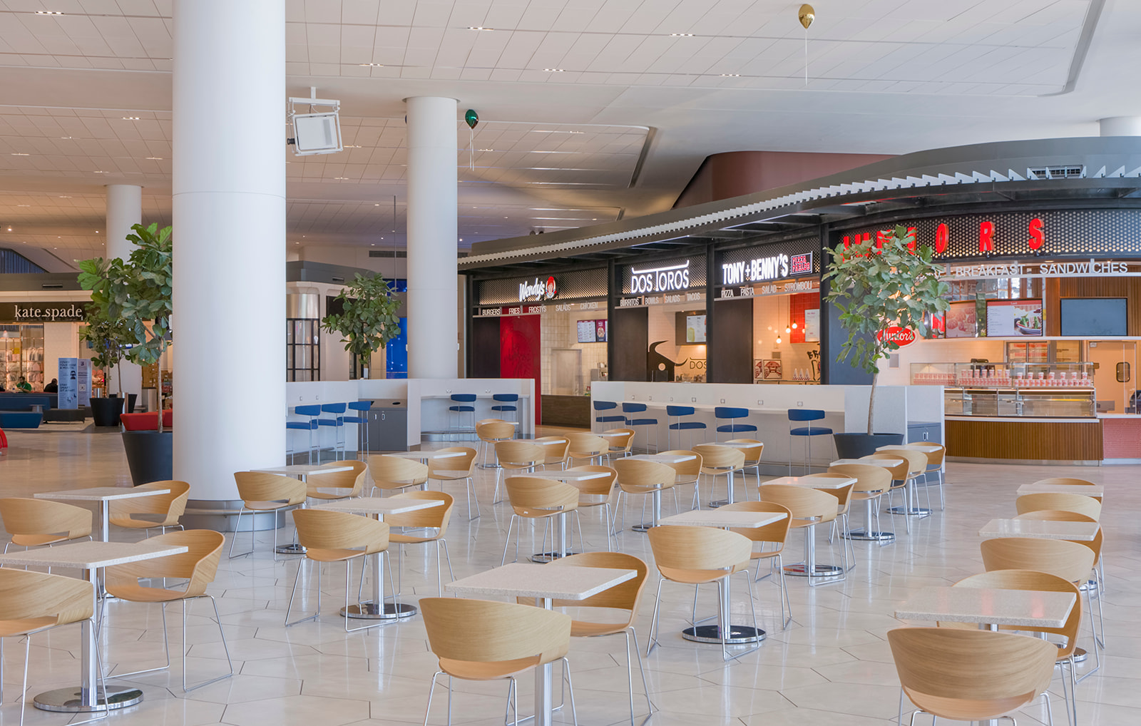 The new halls feature concessions and restaurants including the iconic New York Junior’s Cheesecake, New York Favorites Brooklyn Diner, Hill Country BBQ, Think Coffee and more. The new Arrivals and Departures Hall showcases permanent public art installations curated by the Public Art Fund to enhance passenger experience.
