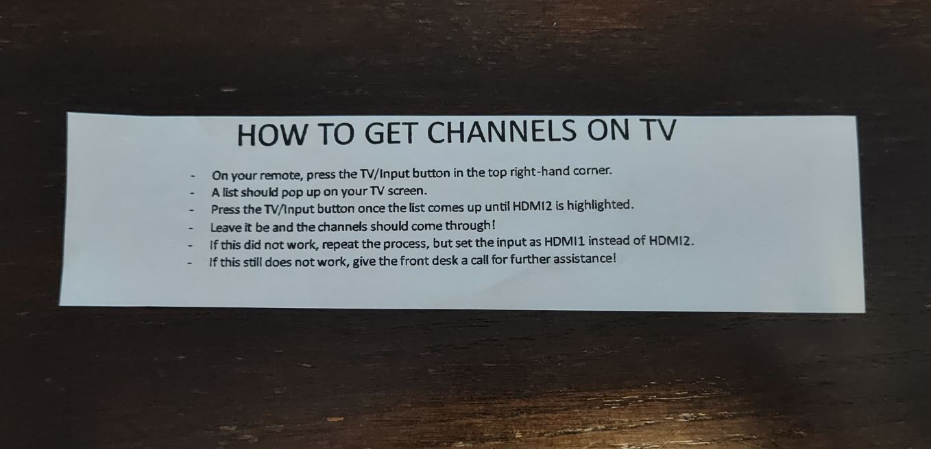 Unfortunately, the TV in our room was an Onn/Roku TV, and these instructions didn’t apply. I’d be required to log into YouTube TV. I didn’t care that much to bother. The front desk manager later clarified building “wiring” precluded cable upgrades, and ownership opted to put these Onn/Roku televisions in 10-15 of the hotel’s 120 rooms. Other rooms are stuck with these low-rent TV instructions.