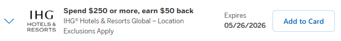 Earn a one-time $50 statement credit after using your enrolled eligible Card to spend a minimum of $250 USD in 1+ qualifying purchases on room rate & room charges at select IHG® Hotels & Resorts in US, Canada, Mexico, Caribbean, UK, Japan & Germany from 2/25/26 to 5/26/26. Book at IHG.com. Location exclusions apply.