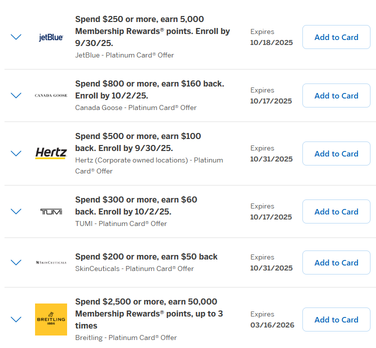 - JetBlue: Enroll by 9/30/2025. Earn 5,000 additional Membership Rewards® points one-time after using your enrolled eligible Card to spend a minimum of $250 in one or more purchases directly with JetBlue by 10/18/2025. Flight must originate in the US and purchase must be in USD.
