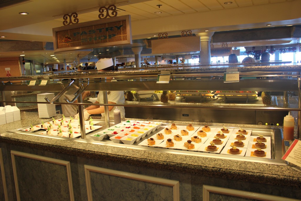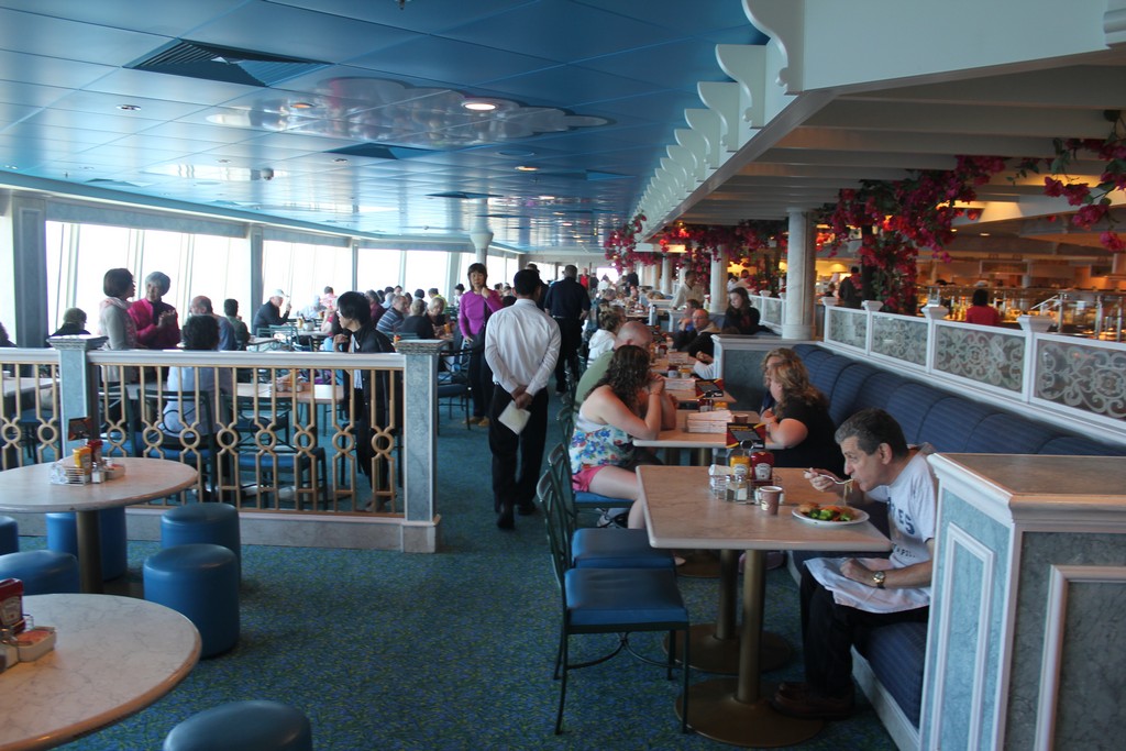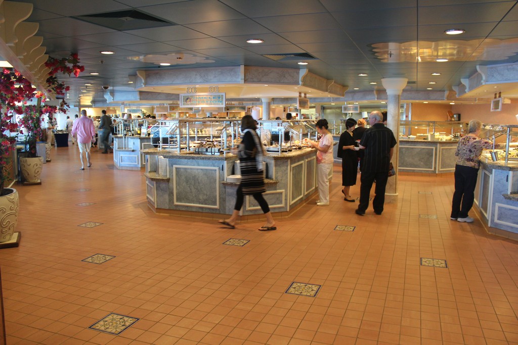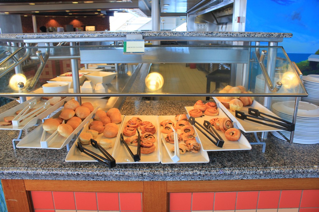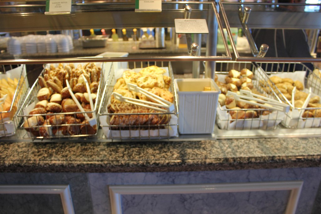 (Both the Garden Cafe & Great Outdoors serve similar food and are located next to each other) The Jewel’s buffets are uninspiring for the most part. While most of the food is boring and in some cases tasteless, the Indian selections at lunch, the salad bar and of course the pretzel rolls are fantastic. As far as breakfast goes, all of the standard fare is available. The morning is by far the busiest time of day as few people on my sailing took advantage of the breakfast served in the dining room. I did notice a couple of times that the staff was slow to restock some popular items on the buffet, but this can happen when a large rush of people comes in.