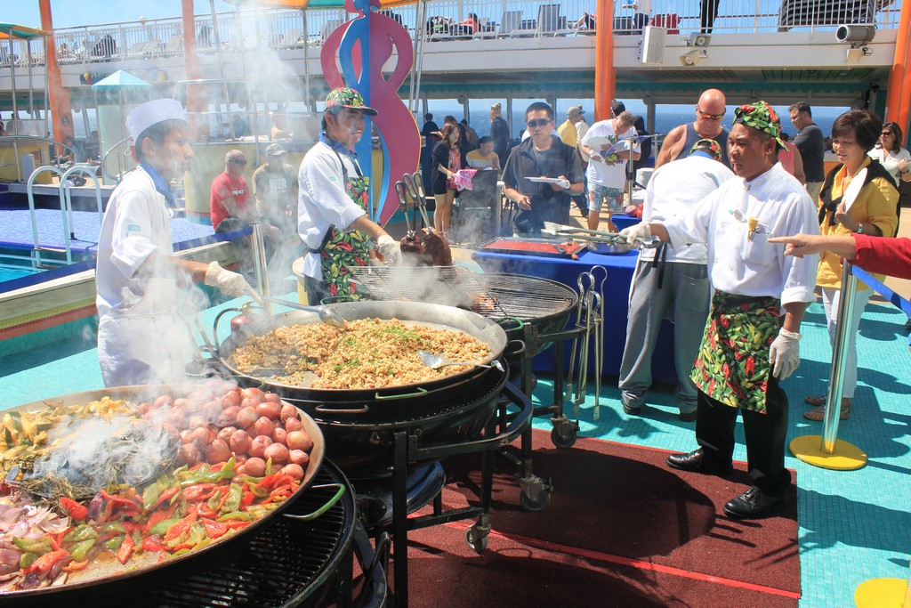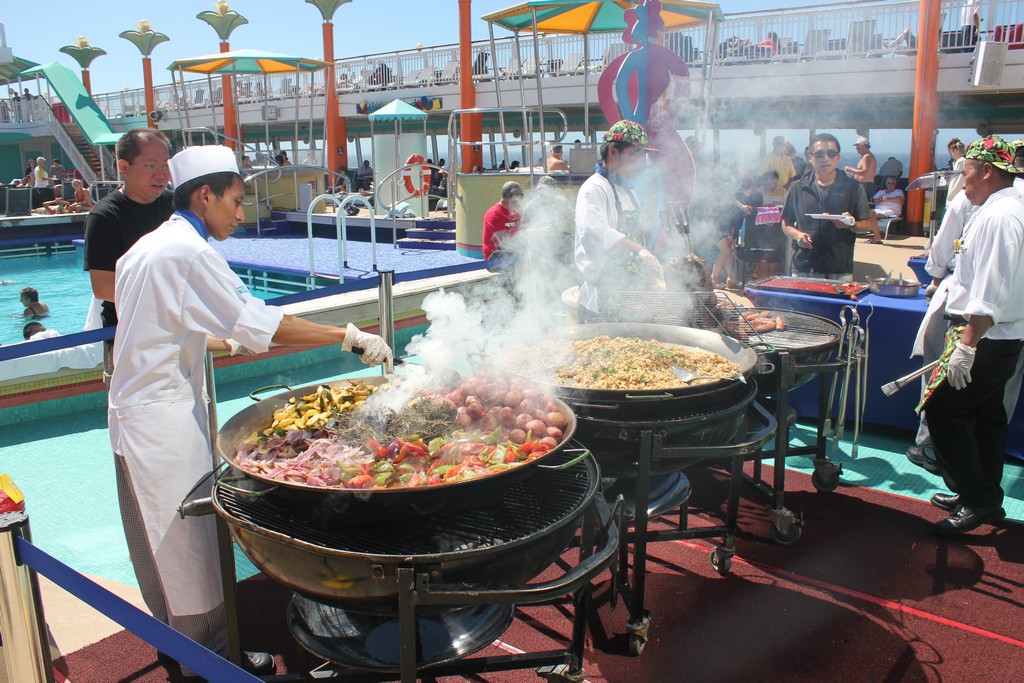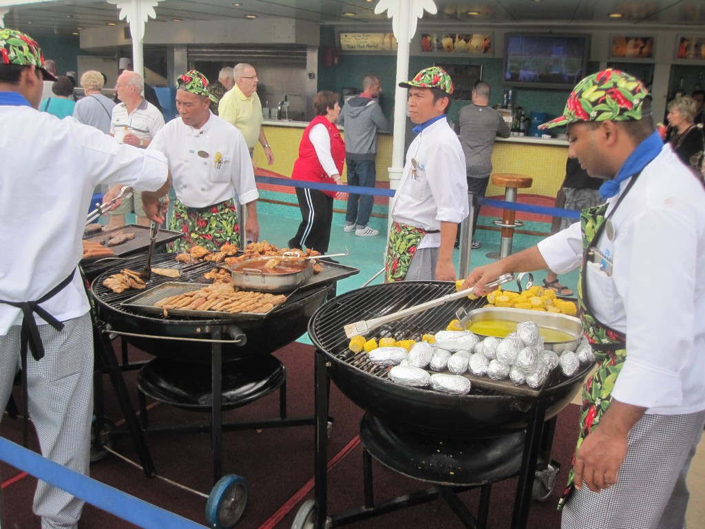 While this pool side grill normally serves buffet style fries, hamburgers and hot dogs for those hanging around the pool, two times on my sailing they converted it into a special place. During two different parties, they popped out a skillet and began cooking meats and vegetables fresh in the middle of the deck. The first party saw them grilling things like hamburgers and hot dogs fresh, but the second one was special. They had tri-tip, ribs, grilled corn on the cob and more. It was fantastic.