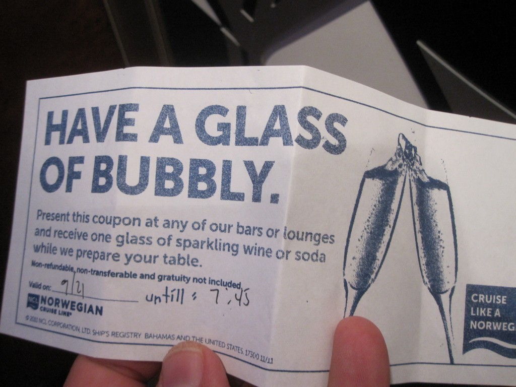Both of the dining rooms serve the same “special” or rotating menu. Since most people want to know which night lobster is served, the Jewel like other Norwegian ships has lobster on the first night. Speaking of the first night, both of the main dining rooms were so overrun that night that they handed out coupons for free champagne to everyone to apologize for the long waits. The wait that night was around forty-five minutes to get a table. Things improved dramatically for the rest of the sailings once people settled in and found their way to the specialty restaurants. I never waited more than 5 minutes for a table the rest of the sailing.
