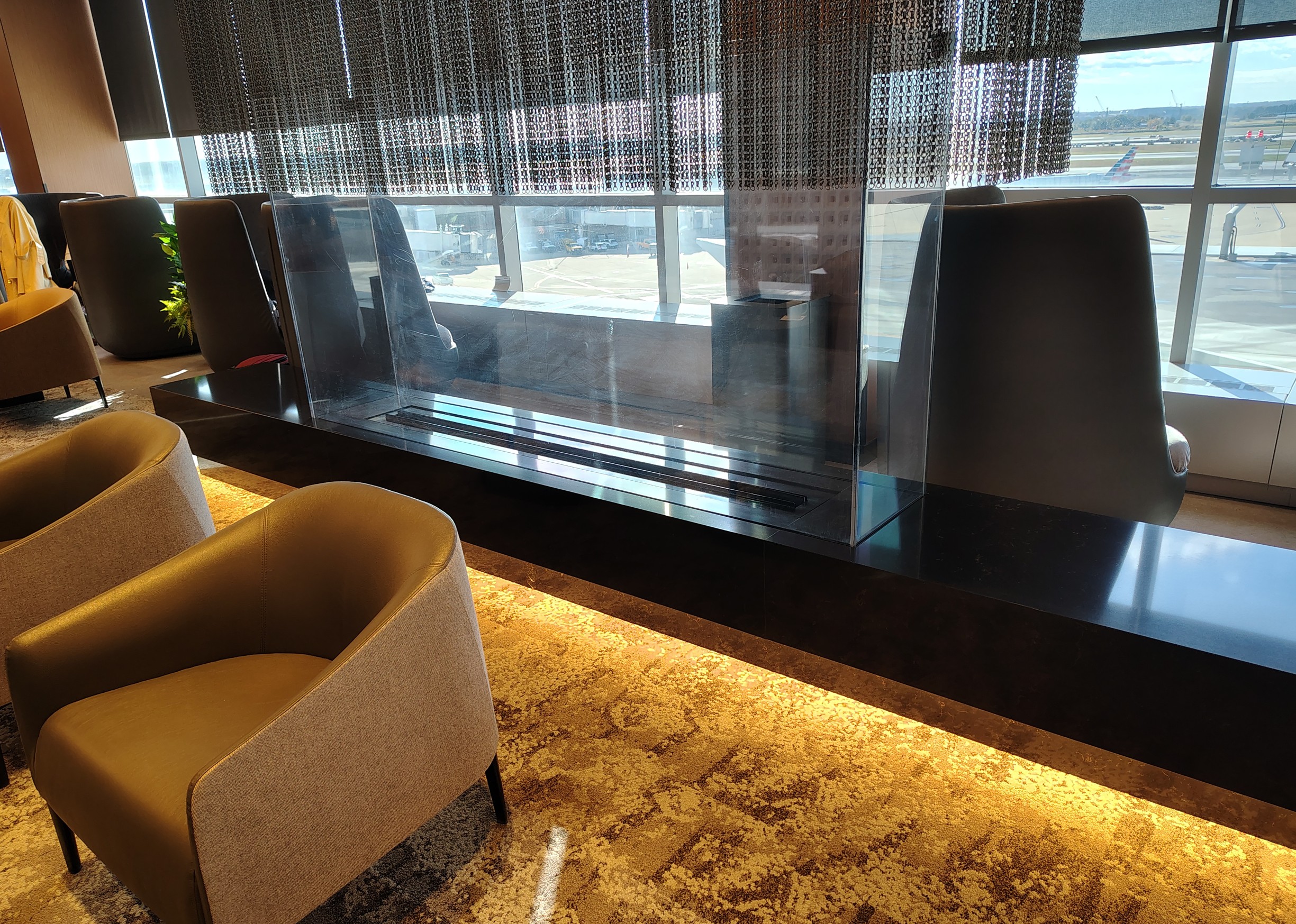 My first stop was the new Admirals Club between on the mezzanine level between gates A15 and A16. You’ll know you’re close when you see the two towering escalators. I enjoyed the open check-in area upon arriving upstairs. The new Flagship Lounge is to the left (maybe another time), and the Admirals Club is to the right. I checked in with a bubbly agent and entered through the not-as-nice-as-the-United-Club’s gate thingy. As you may know by now, this location follows the design cues from a few of the more recent Admirals Clubs, including DCA’s newest and the smaller DEN spot. Unfortunately, it also follows the pattern I’ve seen from AA elsewhere – unlit fireplaces. Behold, yet another reminder of AAusterity.