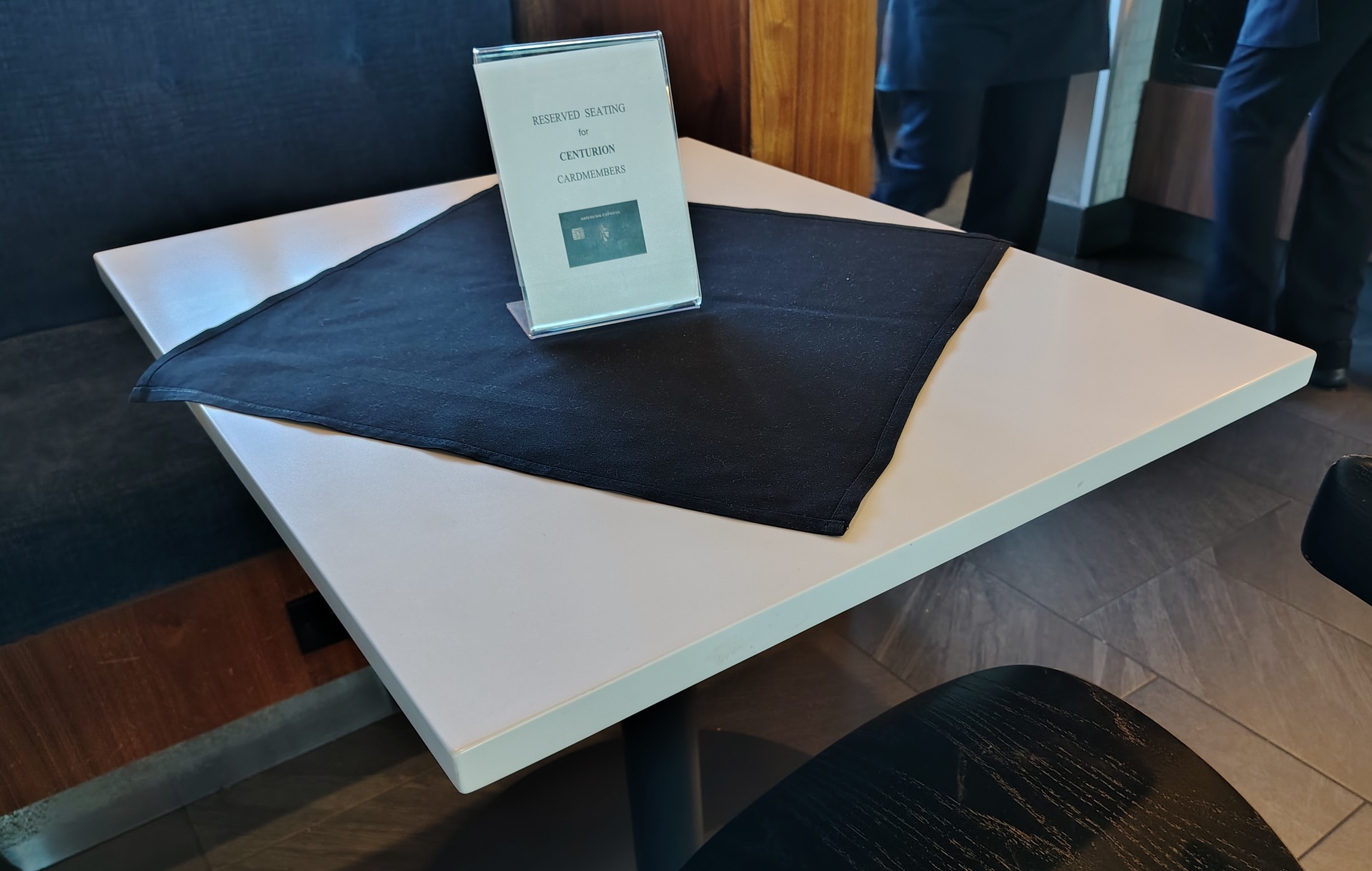 I somehow felt lucky getting a Taco Bell-sized two-top facing the bar. I looked to the right and almost laughed at the sign I saw. The same table sizes nearby were reserved for Centurion cardholders. This may be the first time I felt aggrieved on behalf of such individuals. They pay how much and get this? Before I took a picture of the sign above, I asked for permission from the individual at the adjacent table. He knowingly approved, seemingly in on the situation’s absurdity. About half of the tables in the bar area were reserved, leaving scant space for Platinum cardholders to eat at a proper table.