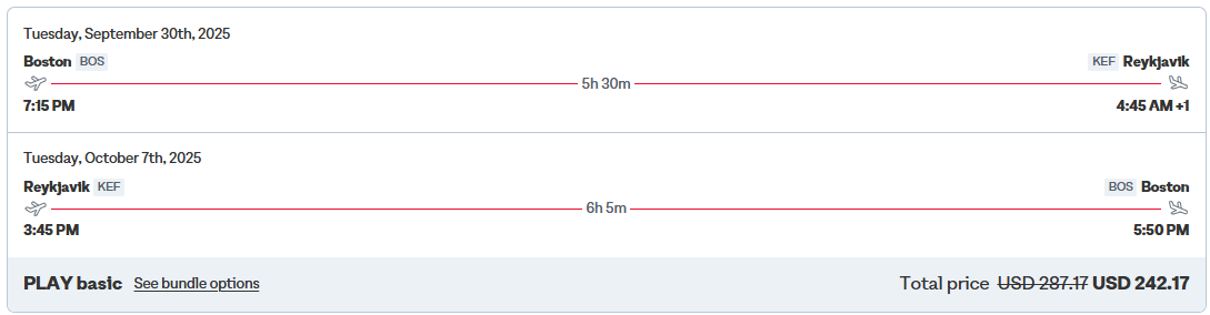 With this sale you can fly from Boston to Iceland for as little as $242 round-trip. You can can also find flights from Baltimore/Washington DC for around $270 and from New York for around $290. Other destinations start around $350 round-trip.