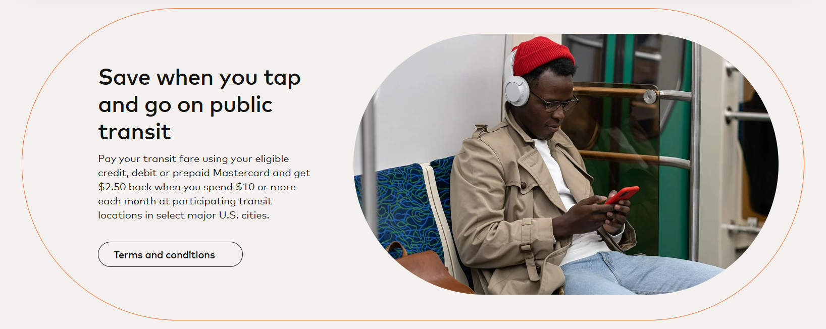 Now through December 31, 2025, tap to pay your transit fare using your eligible Consumer or Small Business credit or debit Mastercard and get a $2.50 statement credit when you spend $10 or more each month at (one or more) participating transit locations.