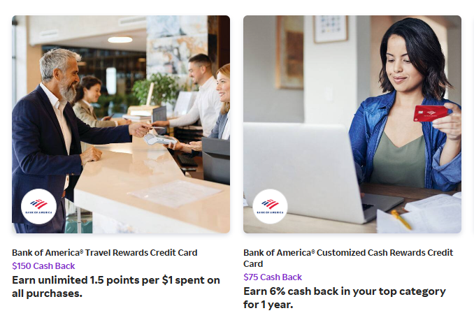 Now they have added two no-fee Bank of America credit cards, with bonuses up to $150 or 15,000 points. That includes: