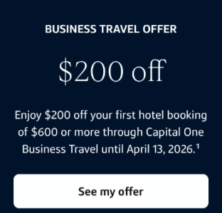 Enjoy $200 off your first hotel booking of $600 or more through Capital One Business Travel until April 13, 2026.