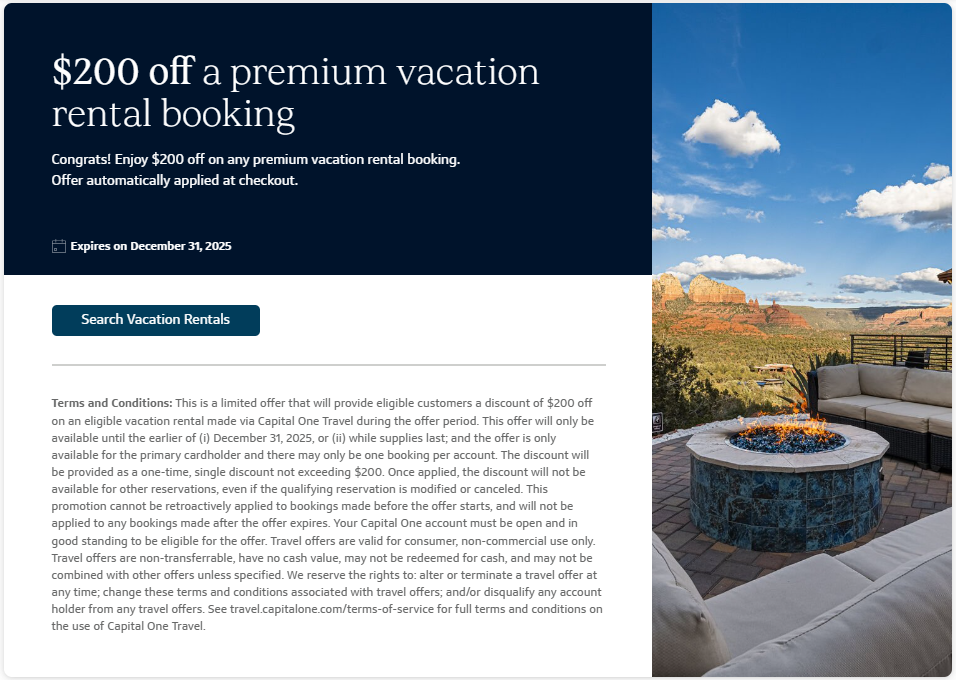 Enjoy $200 off on any premium vacation rental booking. Offer automatically applied at checkout. Expires on December 31, 2025.