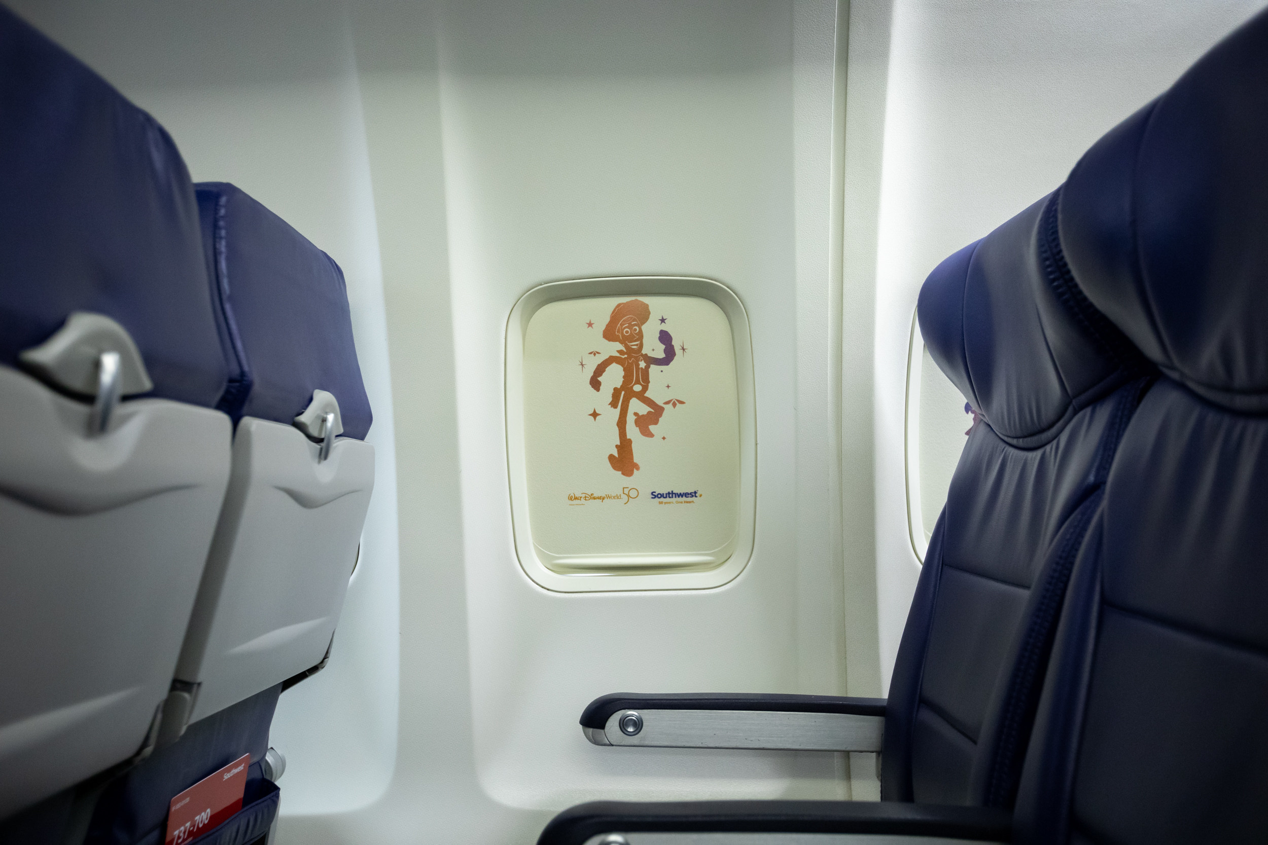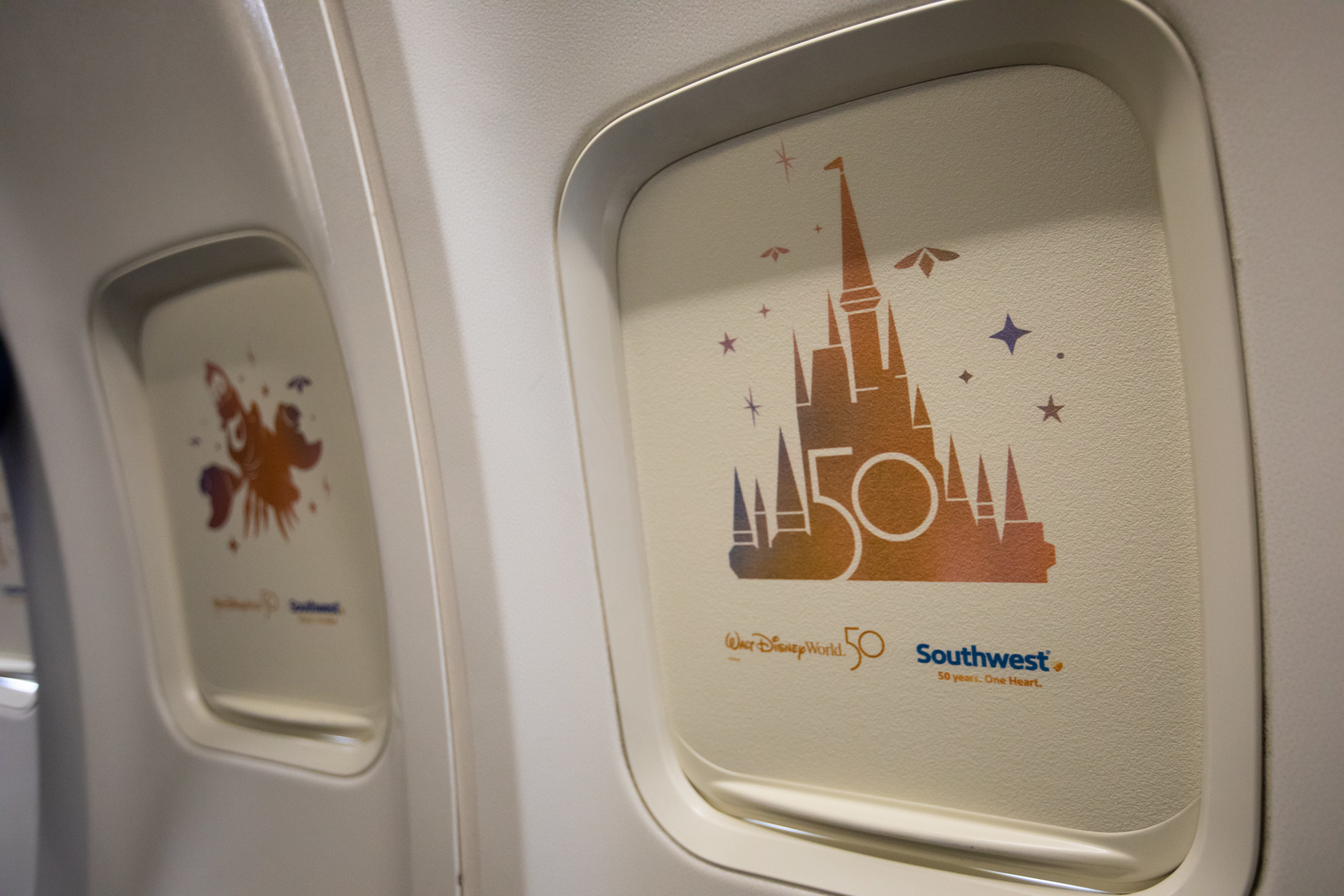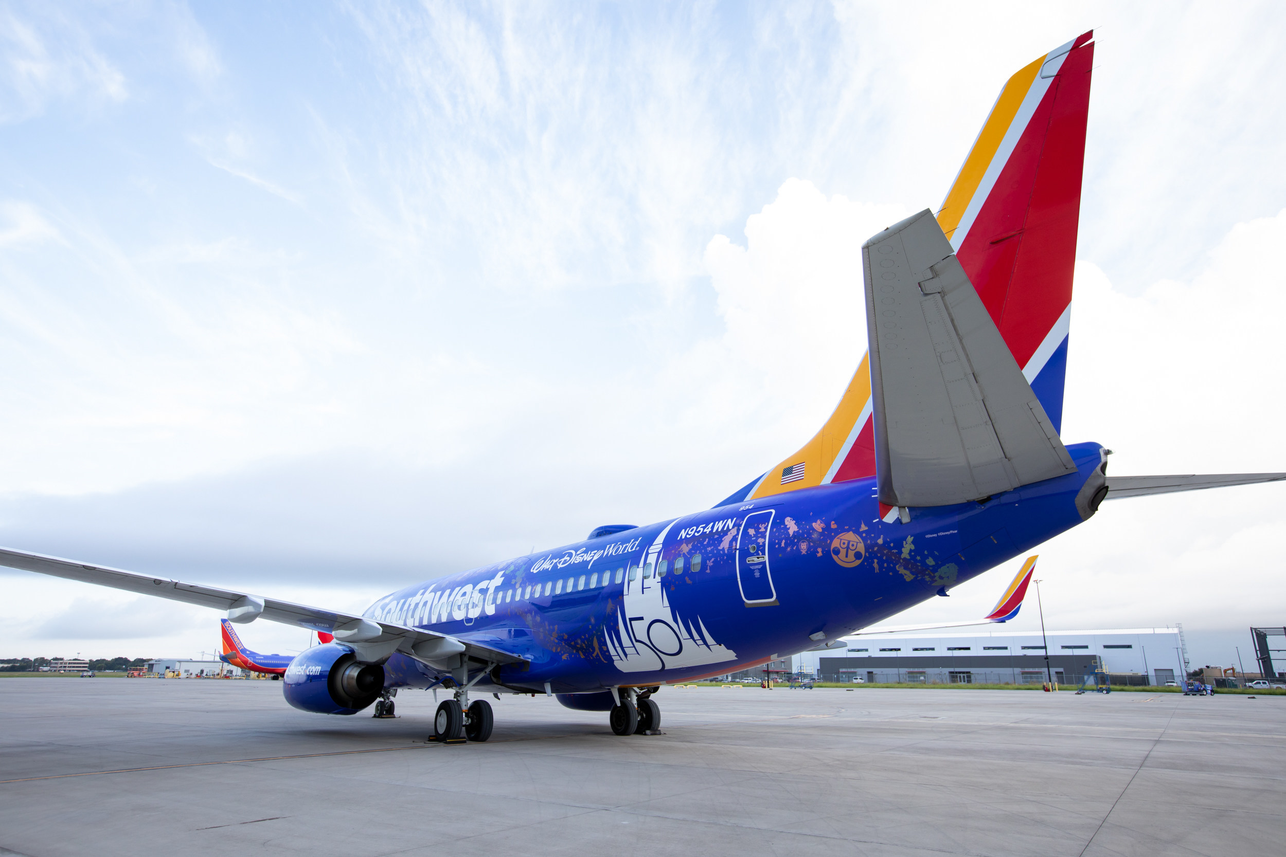 The Boeing 737-700 features 50th anniversary logos of both Southwest AirlinesĀ® and Walt Disney World Resort and is emblazoned with a unique EARidescent treatment created by Walt Disney World Resort. This special promotional aircraft also brings Walt Disney World Resort magic into the interior. Overhead bins and window shades sparkle with beloved Disney characters.