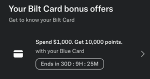 Spend $1,000 or more with your Bilt card by May 13, 2026 and earn 10,000 bonus points. This offer is showing up in the Wallet tab.