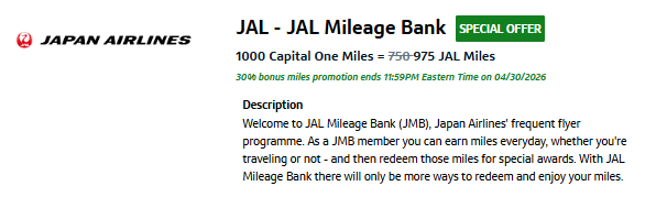 Capital One has launched a new transfer bonus for Japan Airlines. You can now get 30% more JAL Miles when you transfer Capital One miles by 11:59PM Eastern Time on 04/30/2026.