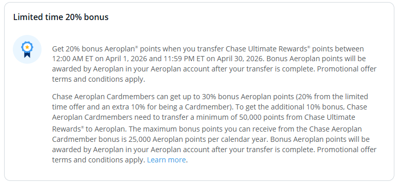 Chase has launched a 20% bonus for transferring Ultimate Rewards points to Aeroplan points. The offer is valid now through 11:59 PM ET on April 30, 2026. Bonus Aeroplan points will be awarded by Aeroplan in your Aeroplan account after your transfer is complete.