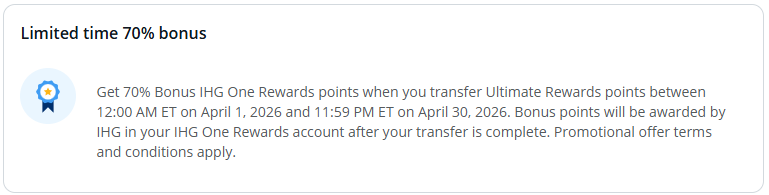 Last and least, you can also get 70% Bonus IHG One Rewards points when you transfer Ultimate Rewards points by 11:59 PM ET on April 30, 2026. Bonus points will be awarded by IHG in your IHG One Rewards account after your transfer is complete.