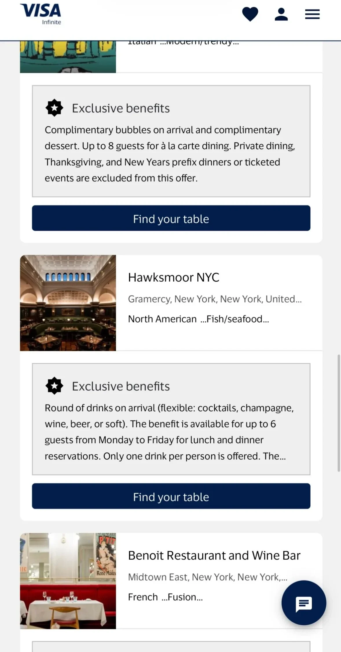 Once you log in, navigate to “Dining” and click the “Exclusive Benefits” option. Here you you will see eligible restaurants that offer these exclusive dining perks. There are very few eligible restaurants in major cities like NYC, LA and Miami and maybe others, and some abroad in Canada and Mexico.